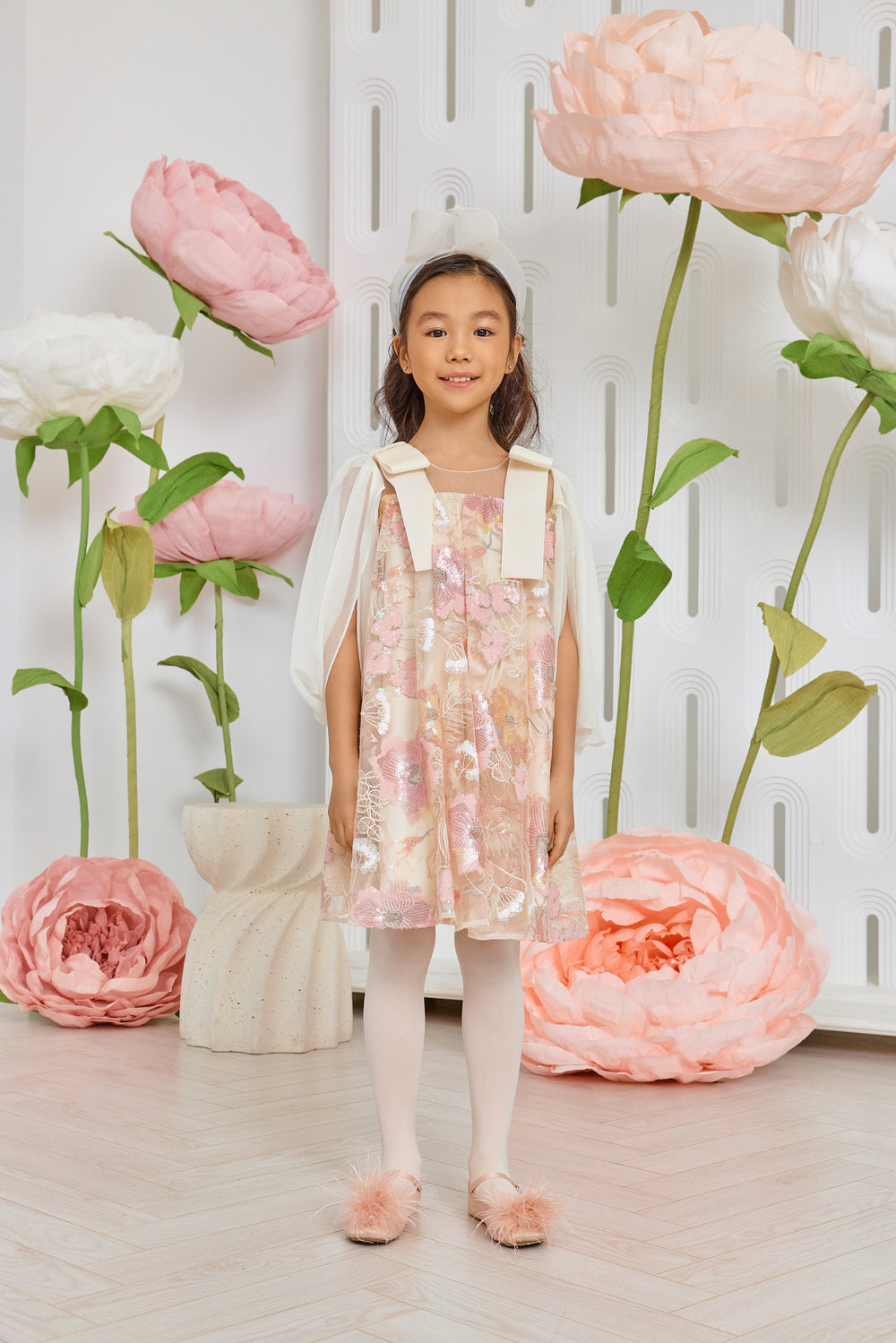 An enchanting creation designed to capture the magic of special occasions. This exquisite dress features delicate floral lace in soft shades of pink and ivory, intricately embroidered with shimmering sequins for a subtle sparkle.