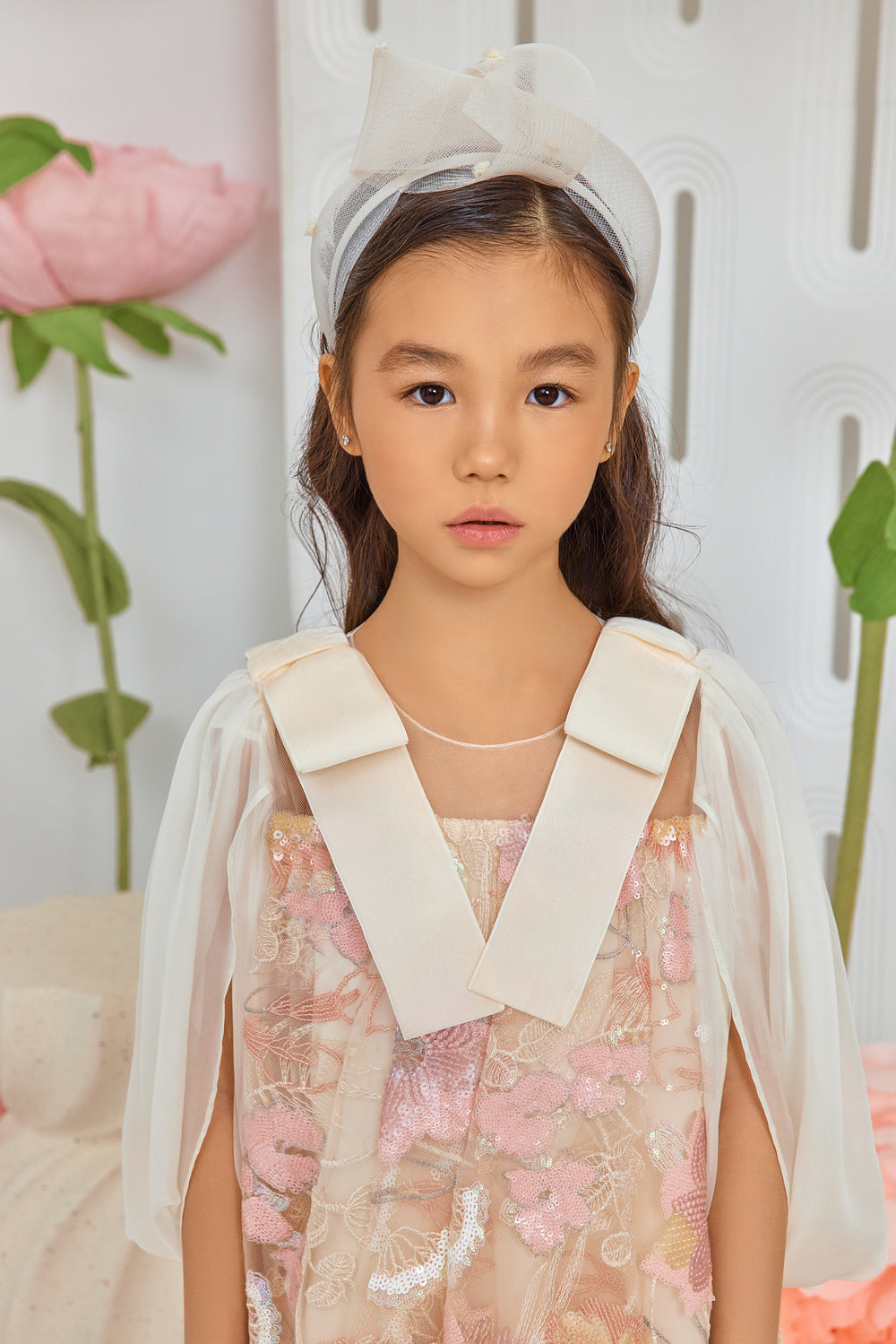 Pink and ivory sequin floral lace dress with ivory chiffon sleeves and velvet bows