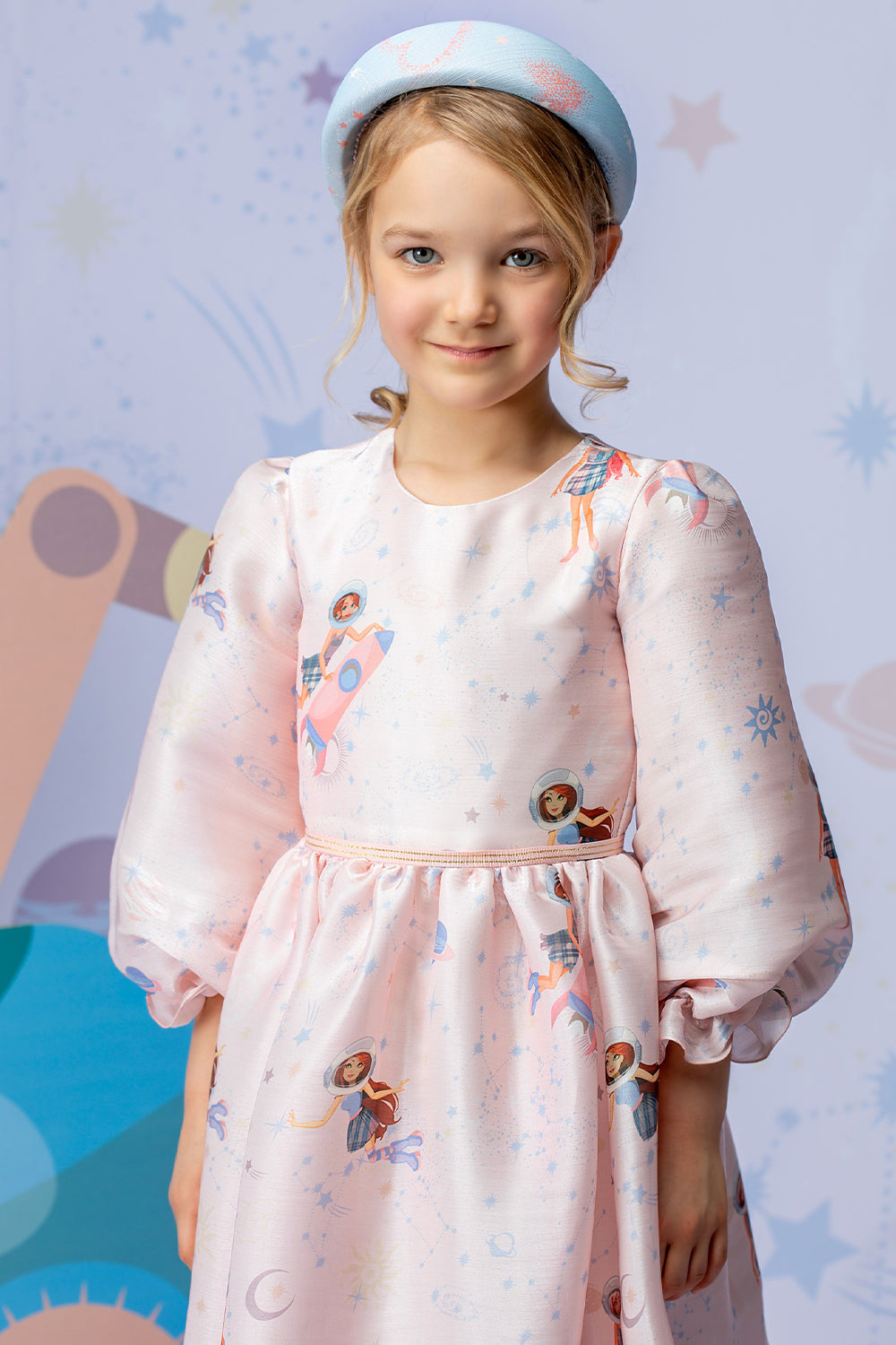 Soft pink Cosmic girls printed ankle length dress with long sleeves