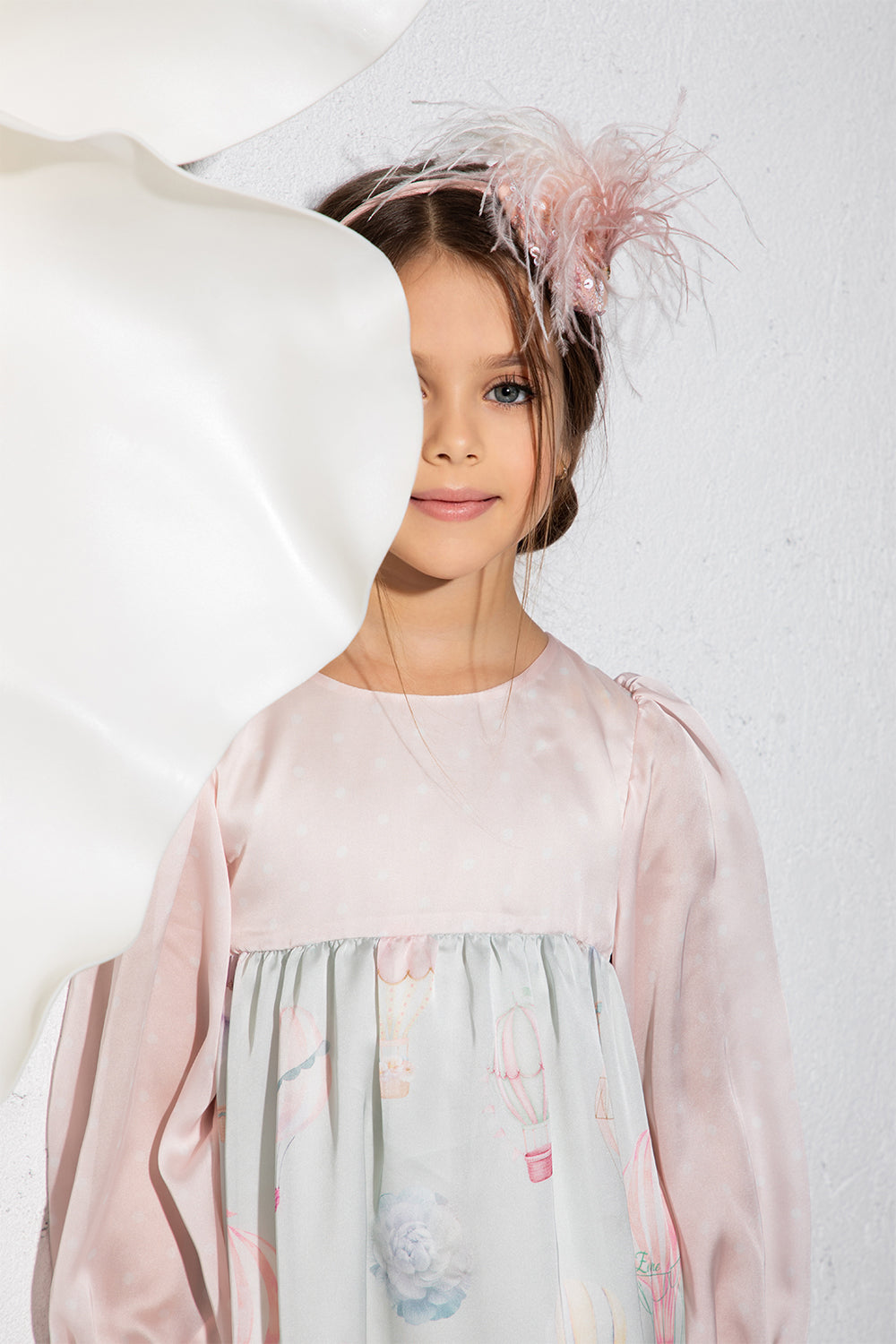 This chiffon dotted dress with balloon print is playful and charming, perfect for adding a whimsical touch to any wardrobe. Made from light, airy chiffon, it features a delicate dotted pattern and a lively print of colorful balloons, giving it a dreamy and cheerful vibe. The dress is designed with a relaxed, flowing silhouette that drapes gracefully, complete with subtle gathers at the waist for a flattering fit. With its light texture and imaginative print, this dress makes an ideal choice for festive occasions or casual outings that call for a fun, youthful look.