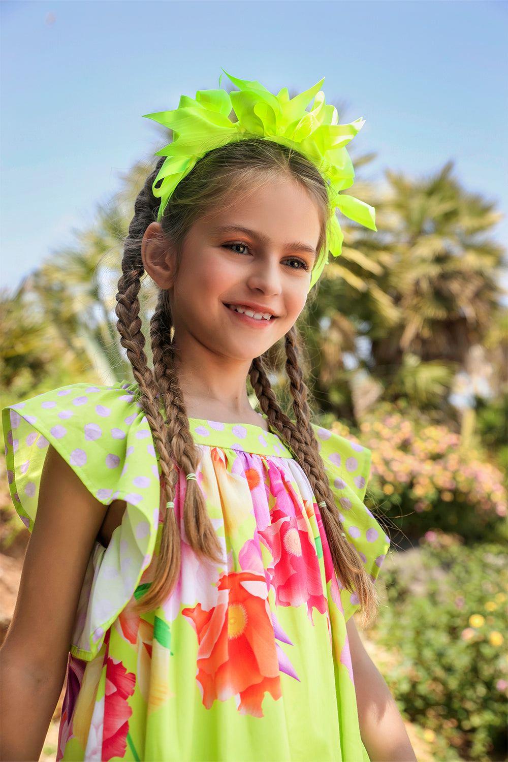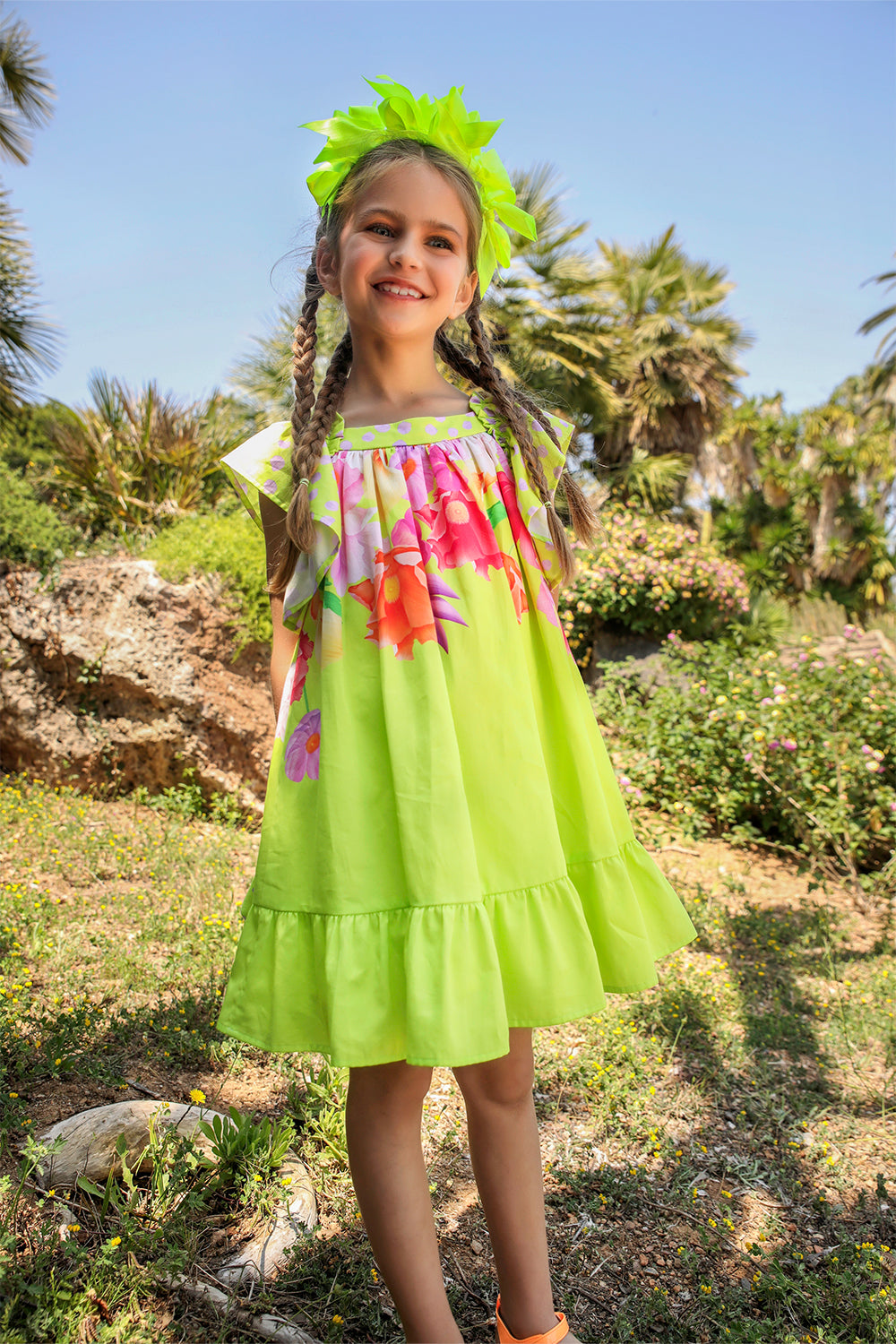 A vibrant neon green dress bursting with energy and charm. Adorned with a bright floral print, this dress radiates playful elegance, making it perfect for statement styling. The standout feature is a chic bow on the back, adding a touch of femininity and sophistication. Crafted for both comfort and style, this dress is ideal for summer outings, parties, or any occasion that calls for bold, eye-catching fashion.