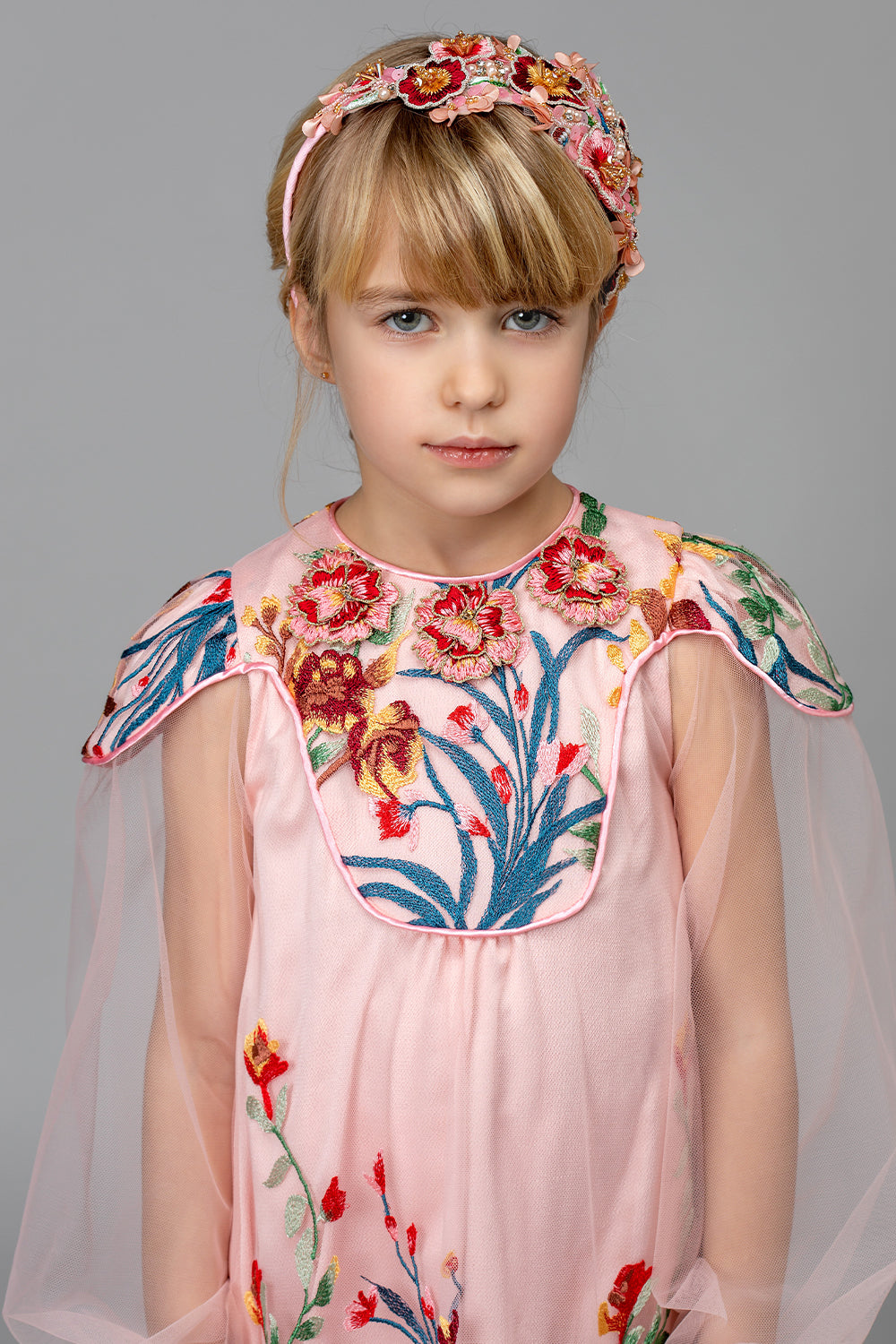 Sweet and sophisticated, this light pink dress features delicate floral lace embroidery and elegant long tulle sleeves for a dreamy, fairy-tale look. Perfect for special occasions, it blends soft charm with graceful detail, making her feel like the star of the show.
