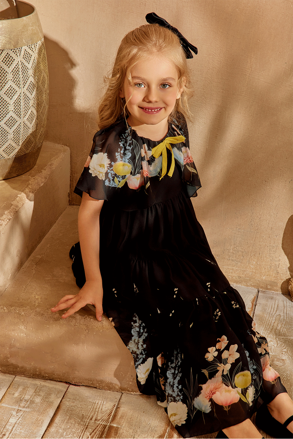 This black chiffon dress exudes timeless elegance, featuring a vibrant floral cape and a cheerful yellow bow detail.