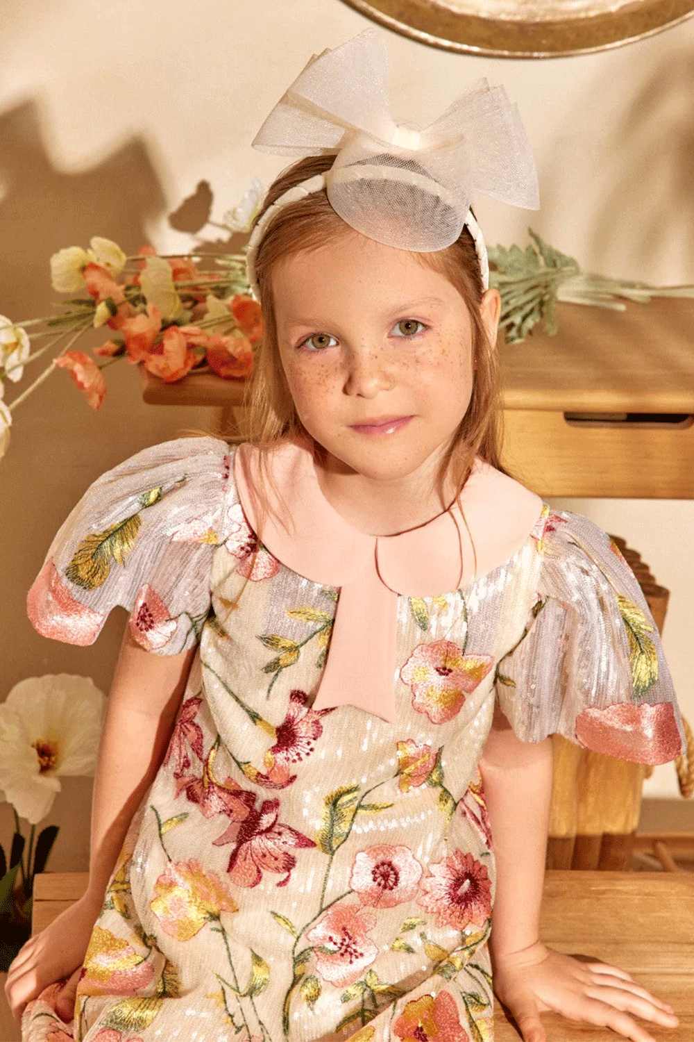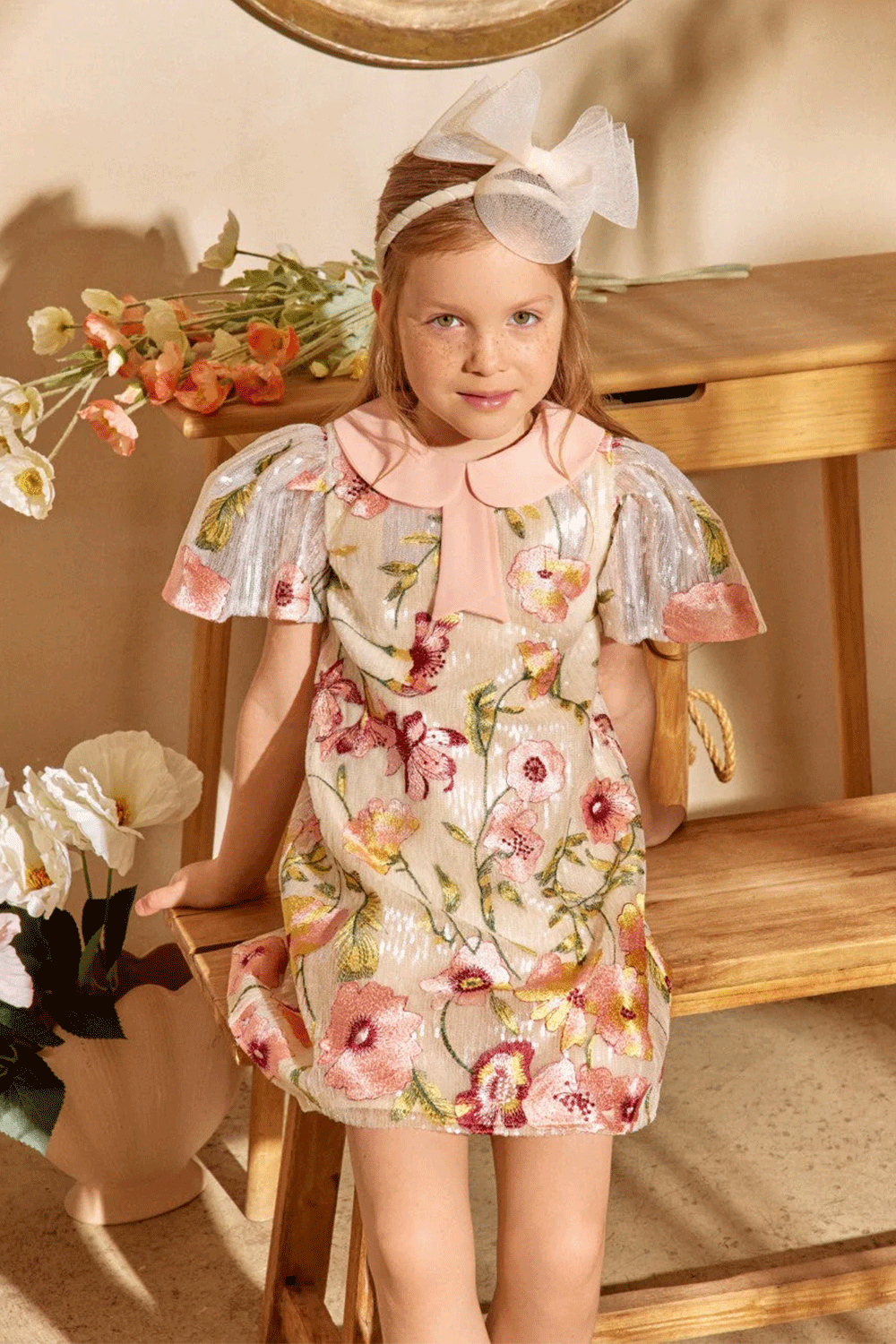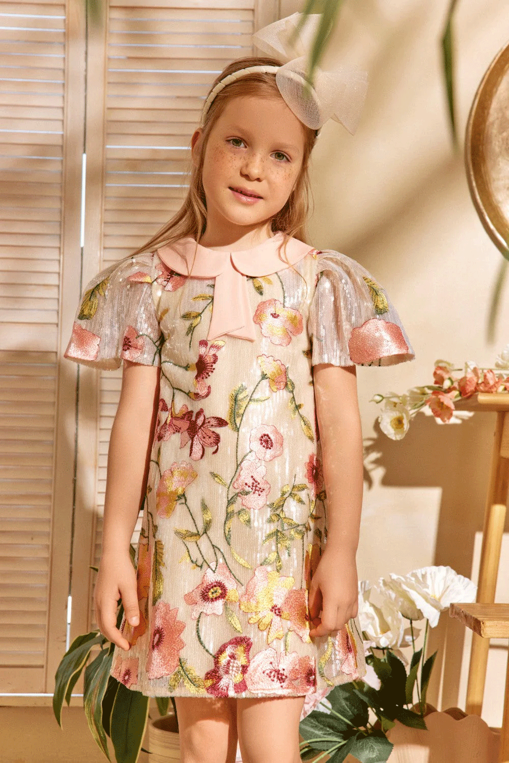 Ivory sequin dress with floral embroidery, pleated metallic sleeves, and a soft pink peter pan collar with bow detail