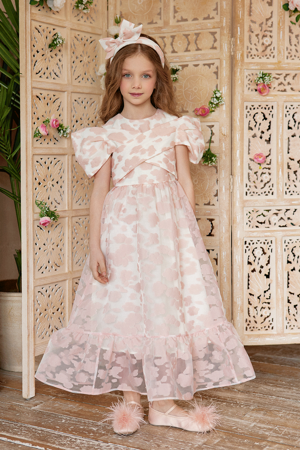 This long blush pink organza dress exudes pure charm, perfect for your little one's special moments.