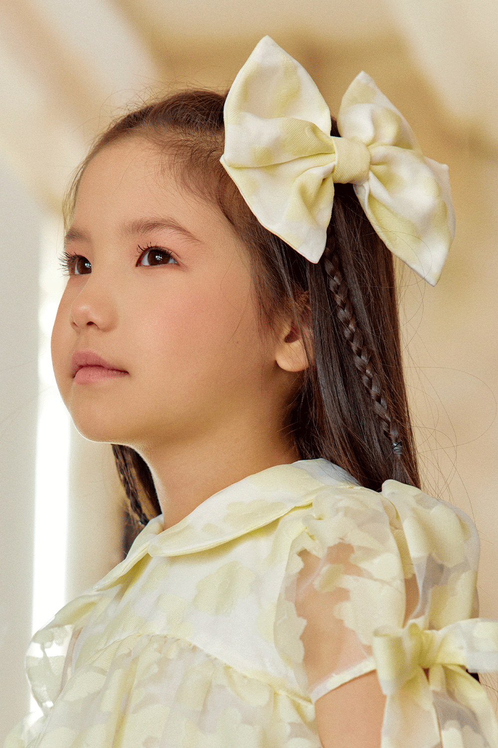 This oversized pale yellow bow hair clip captures sweet charm, presented in delicate floral organza.