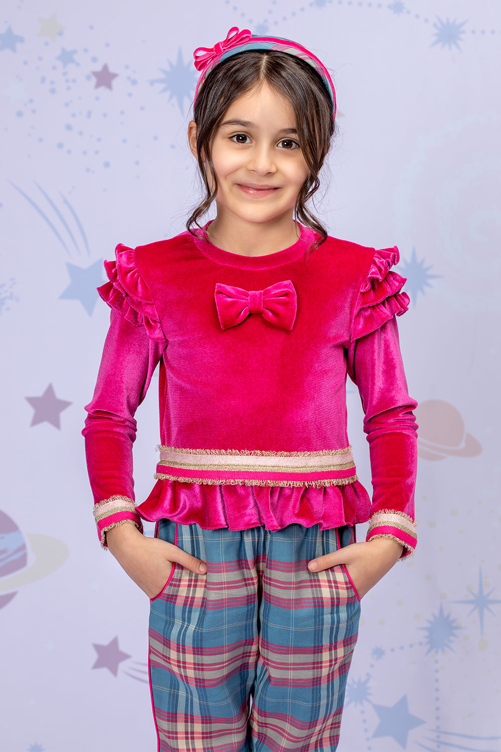 Chic and comfortable, this two-piece set is perfect for stylish little trendsetters. The rich velvet fuchsia top adds a touch of elegance and softness, while the classic plaid trousers bring a timeless, tailored look. Ideal for special outings or polished everyday wear, this set blends cozy textures with standout style — effortlessly fashionable and ready for any occasion.