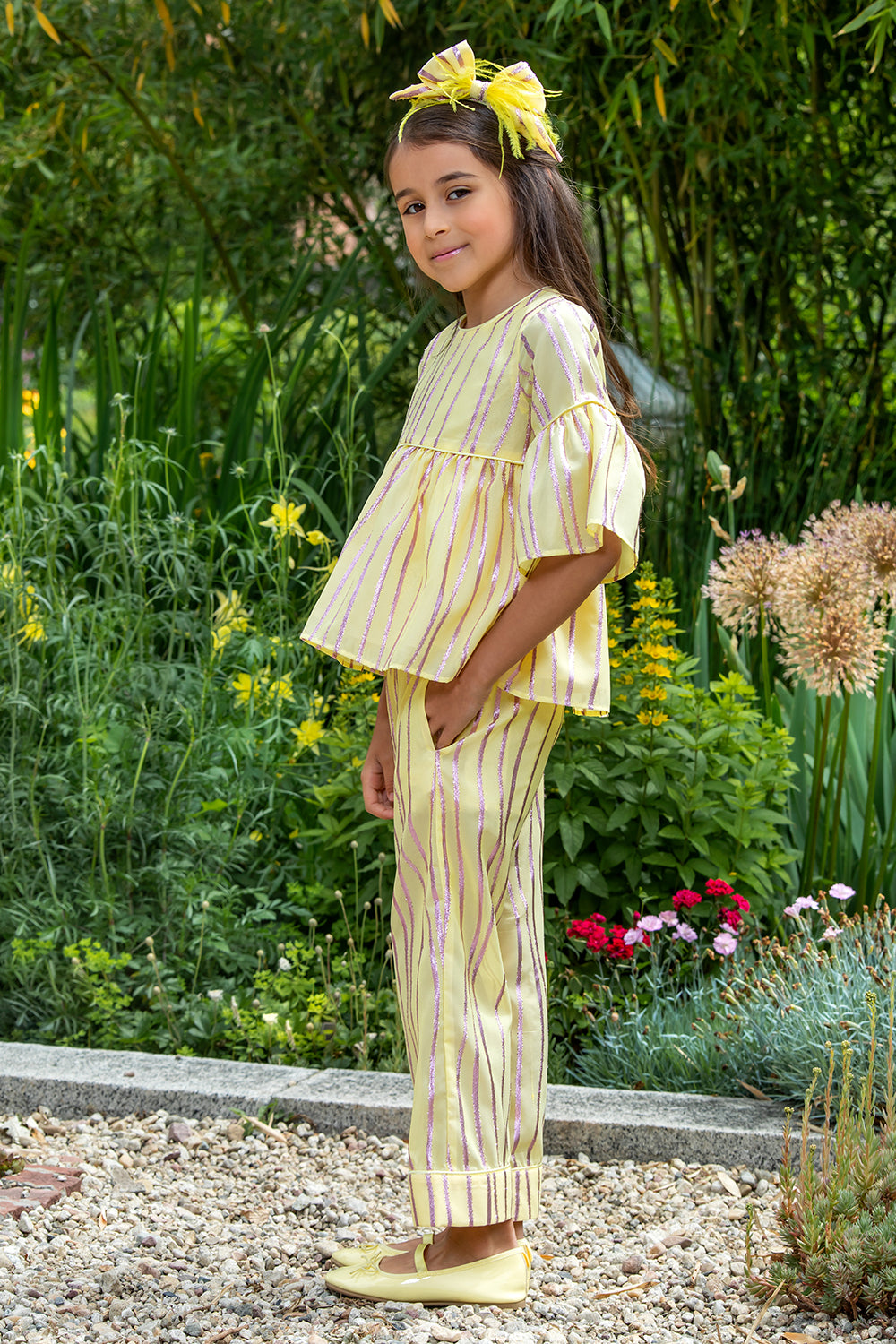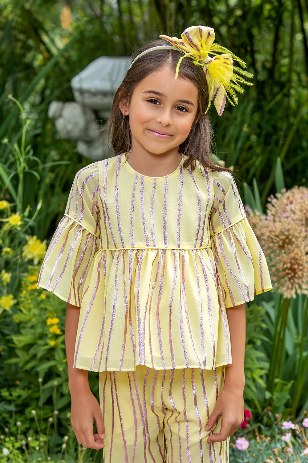 Bright, breezy, and full of charm — this yellow chiffon set is a fresh take on effortless style. Featuring soft lilac stripes for a playful contrast, the lightweight chiffon fabric offers a flowy, comfortable fit perfect for sunny days. Whether for a special outing or everyday fun, this two-piece set adds a touch of color and elegance to your little girl's wardrobe.