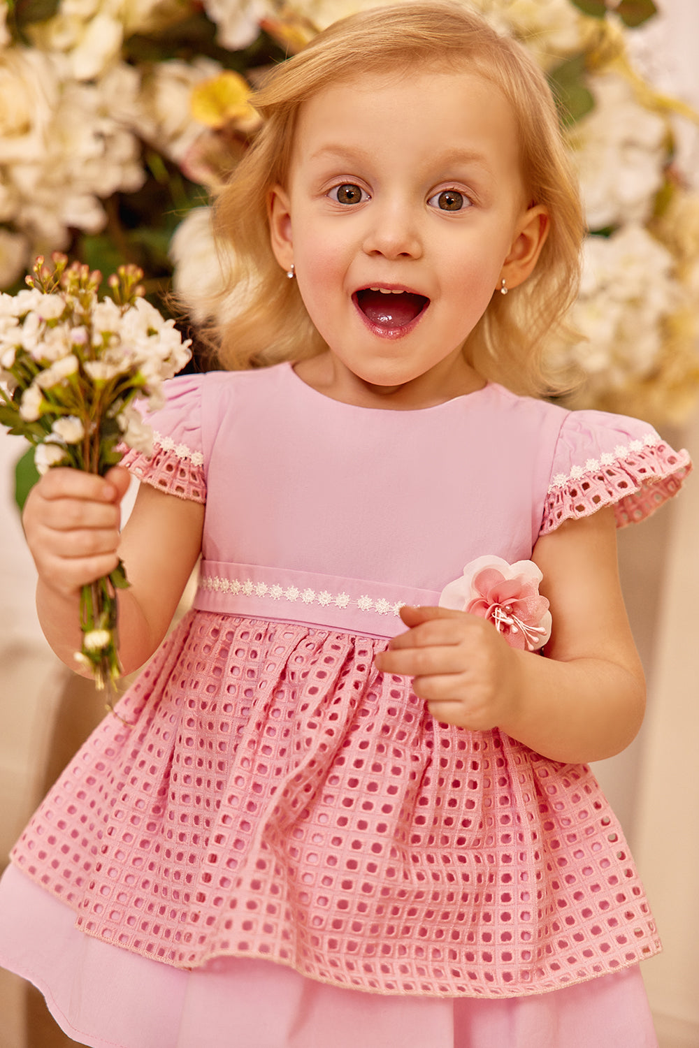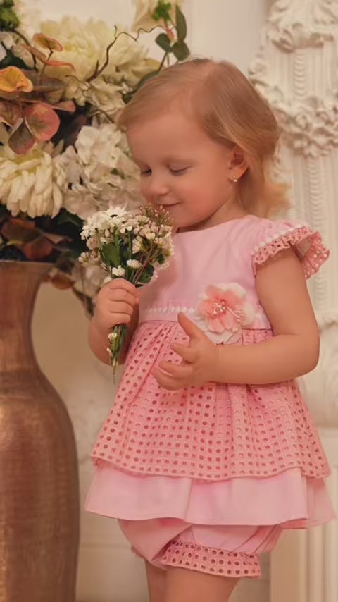 A charming pink cotton baby dress crafted from soft, breathable fabric for all-day comfort. This adorable outfit features delicate details such as gentle gathers and a classic silhouette, perfect for little ones. The pink dress has short sleeves, an oval neckline, a beautiful ribbon detail at the waist and a short length. The dress comes with matching knickers, ensuring a coordinated and cute look. Ideal for special occasions or everyday wear, this set combines style with practicality.